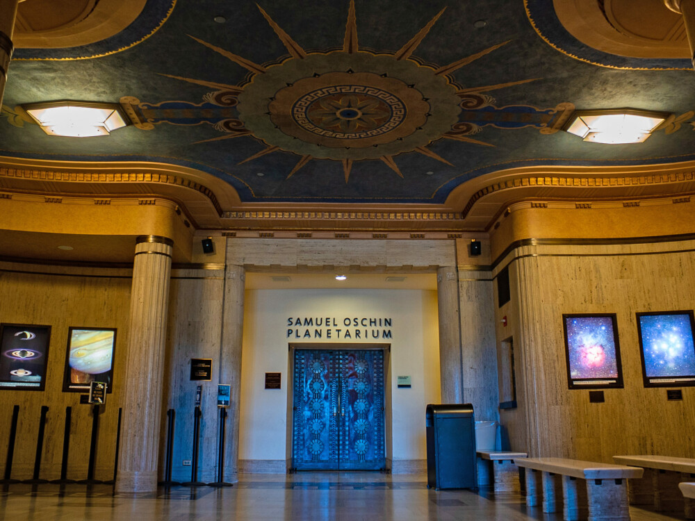 The South Gallery is a nexus connecting the entry to the Samuel Oschin Planetarium, the W.M. Keck Central Rotunda, and Gravity's Stair, which leads down to the lower levels of the building.