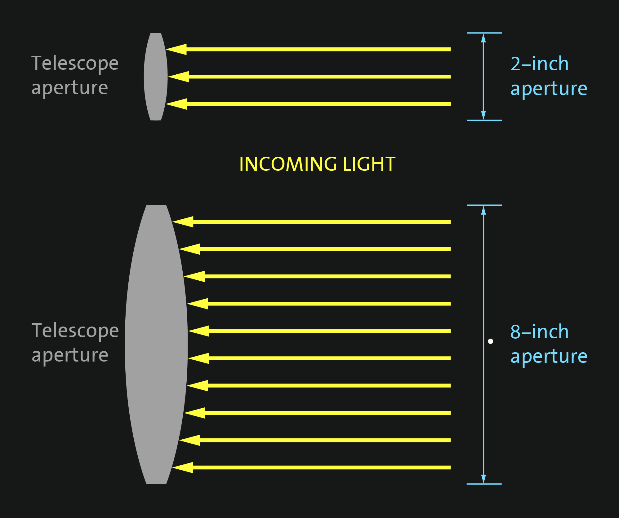 The aperture of a telescope—the size of the opening set by the diameter of its lens or mirror—determines how much light it can gather. The larger telescope on the table collects 800 times more light and can see 28 times farther into space than your eye. The smaller one collects less light and extends your view only about a quarter as far into space. along the western horizon.