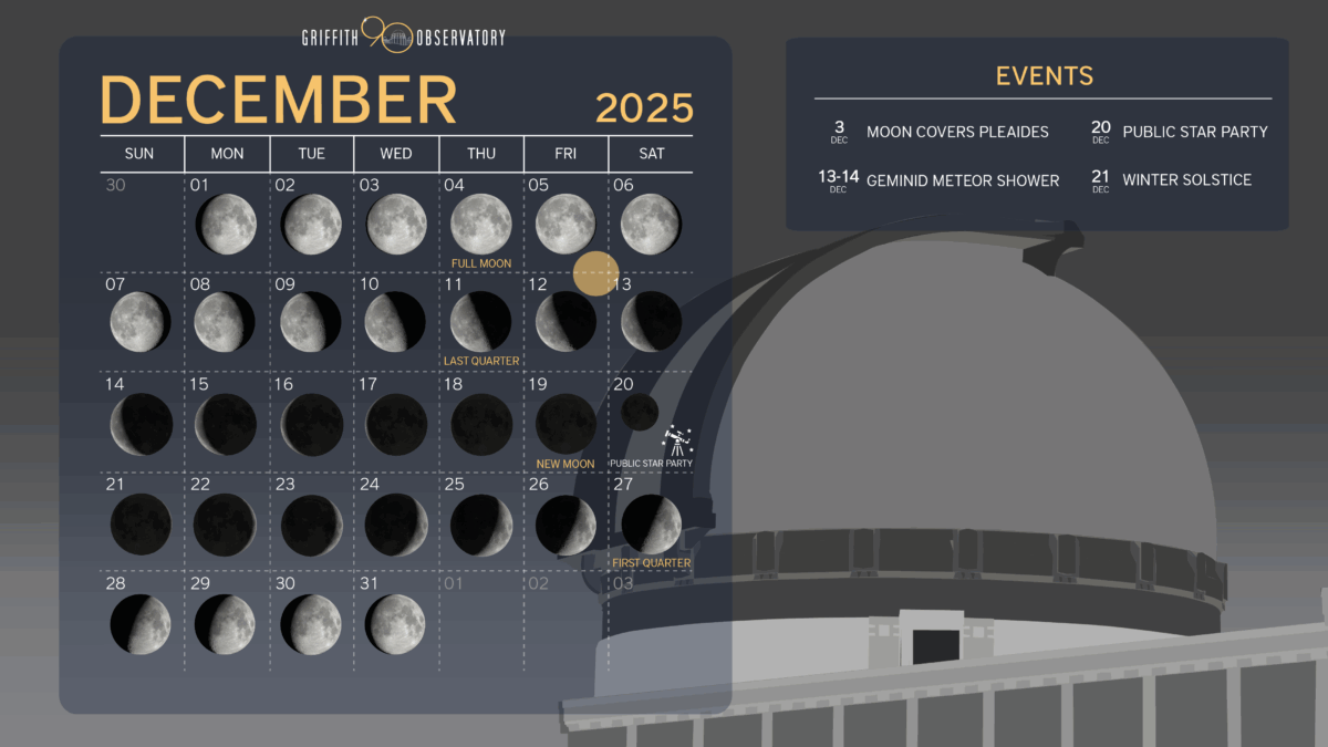 This is the Griffith Observatory Sky Report for the period between December 1 and December 31, 2025. Here are the events happening in the sky of southern California.