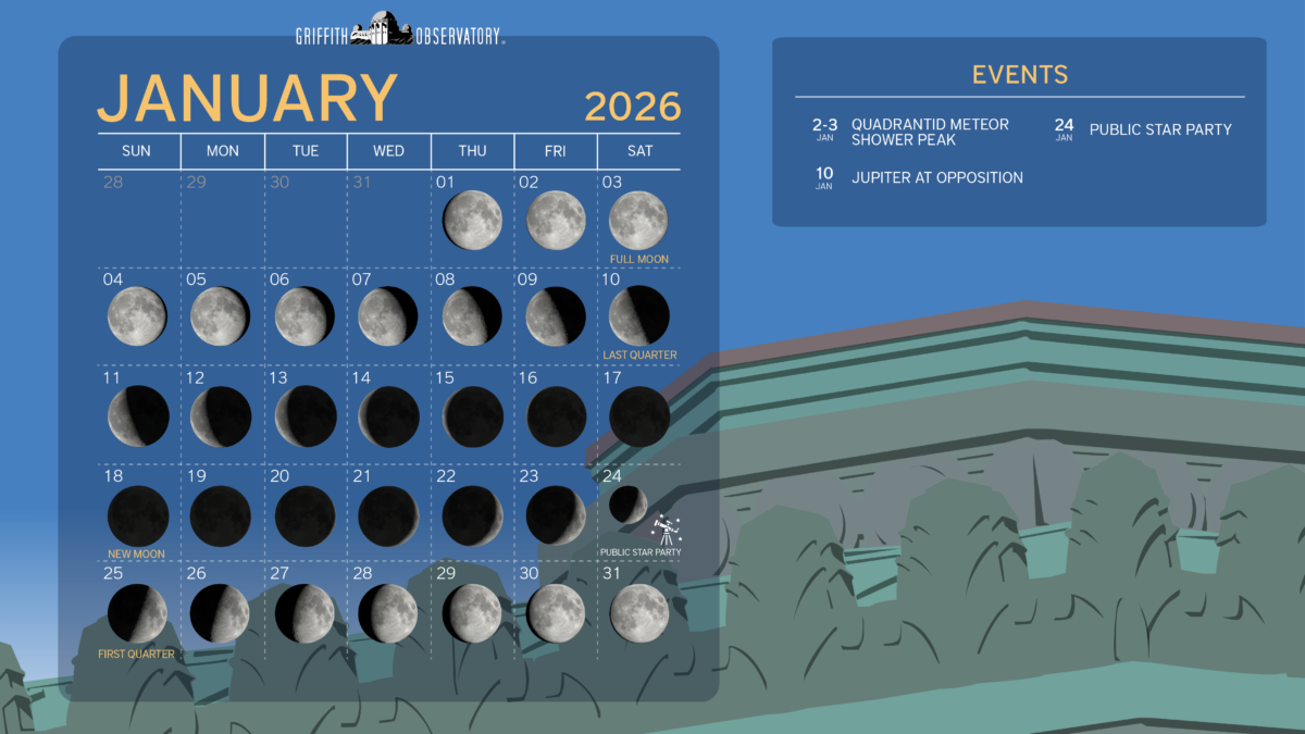 This is the Griffith Observatory Sky Report for the period between January 1 and January 31, 2026. Here are the events happening in the sky of southern California.