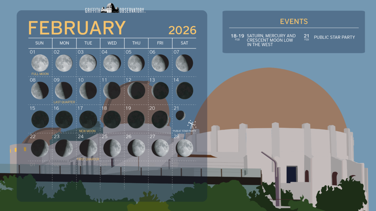 This is the Griffith Observatory Sky Report for the period between February 1 and February 28, 2026. Here are the events happening in the sky of southern California.