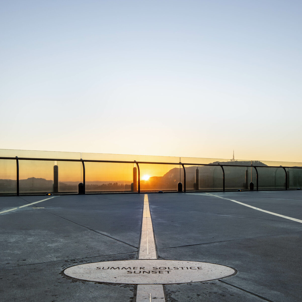 Seven stone and bronze lines embedded in the lower West Observation Terrace radiate out from the building toward the western horizon. Each line points toward a notable sunset or moonset position on the horizon.